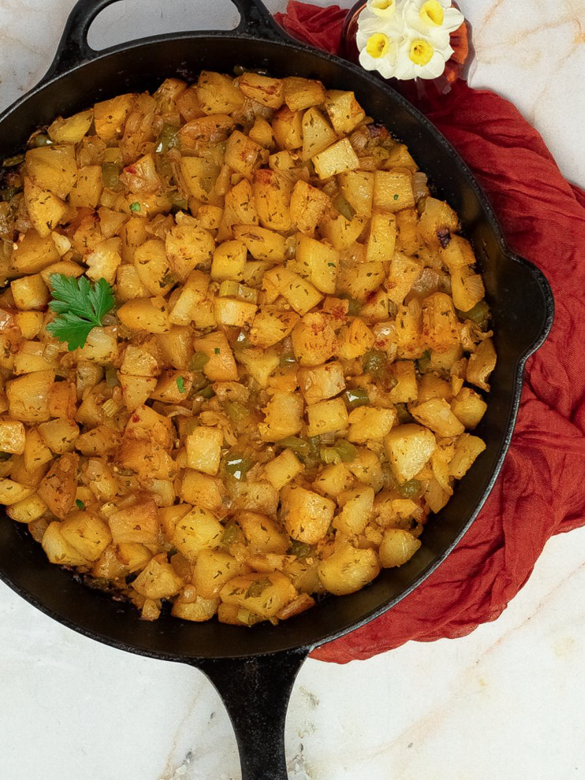 These Cajun roasted potatoes are so warm, comforting, and perfectly seasoned!! Each bite is silky smooth, with soft trinity veggies and tender potatoes melting in your mouth simultaneously.